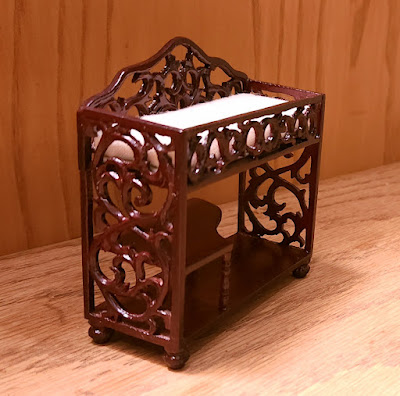 The Beautiful hand-embroidered lace pillow was a gift from my friend Kellie Wachter of Yankee Dimes Sewing. From Creative Hollow, I got the preserve jars, pie, doll, teddy bear, paint palette and brushes, bone carved elephant, tiny bird, shells basket, embroidery set, and a beautiful petit point framed picture. The bigger cross stitched square was done by Granny B's Bonnie Ferguson. The resin baskets and Kathy Tepper burlwood vase are from Miniature Designs. Tea cups and book from Betinha Murta Miniatures. Frogs from Brown's Miniatures. Mirrored etagere from Sandra M. A. Manring. And finally, the 1:144 furniture kits are from Volker Arnold of V A Holzkunst.